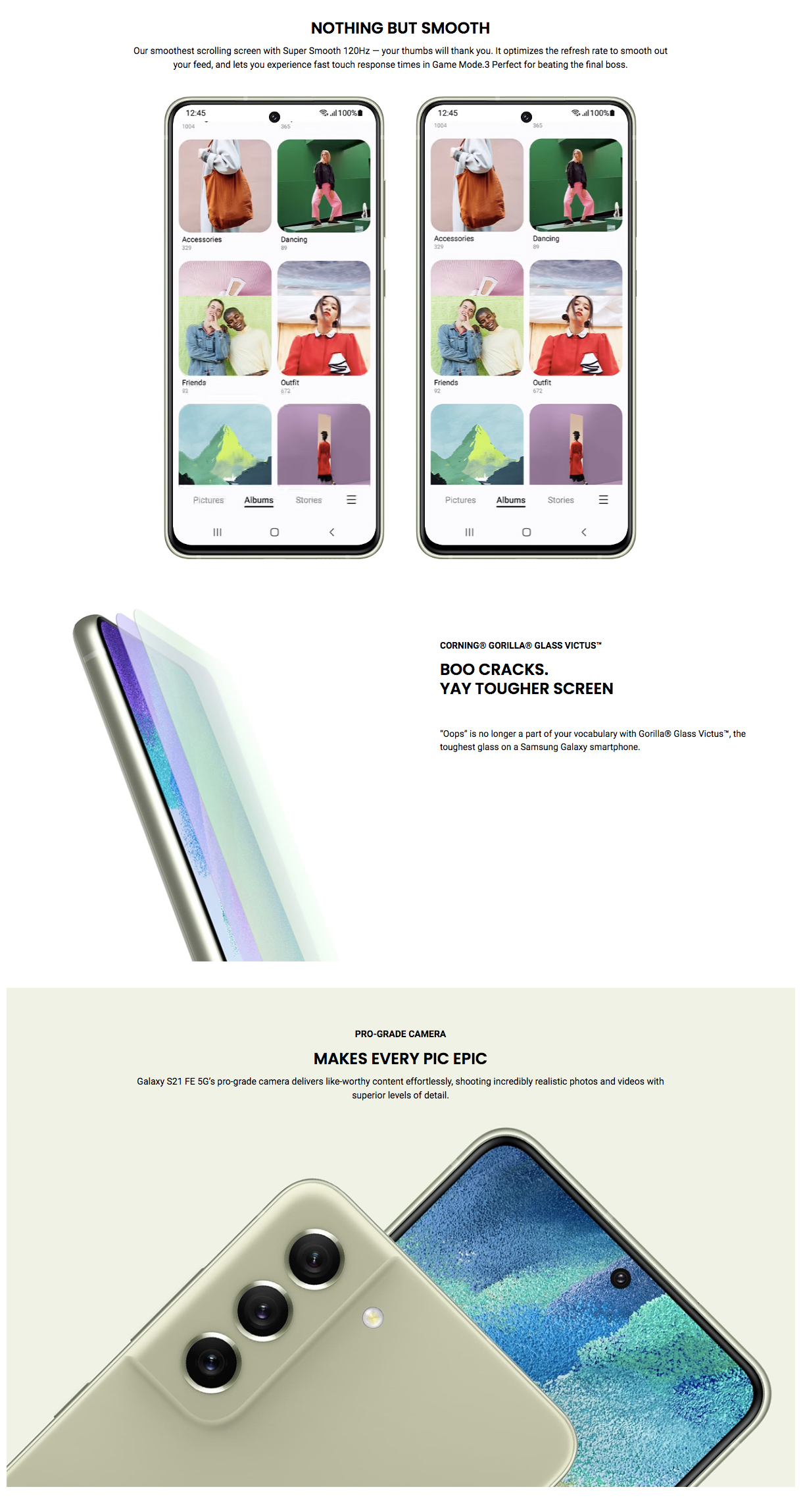 The Galaxy S21 is renowned for its industry-leading camera, and S21 FE 5G is equipped with the same pro-grade setup used to capture the world’s most vivid photos.